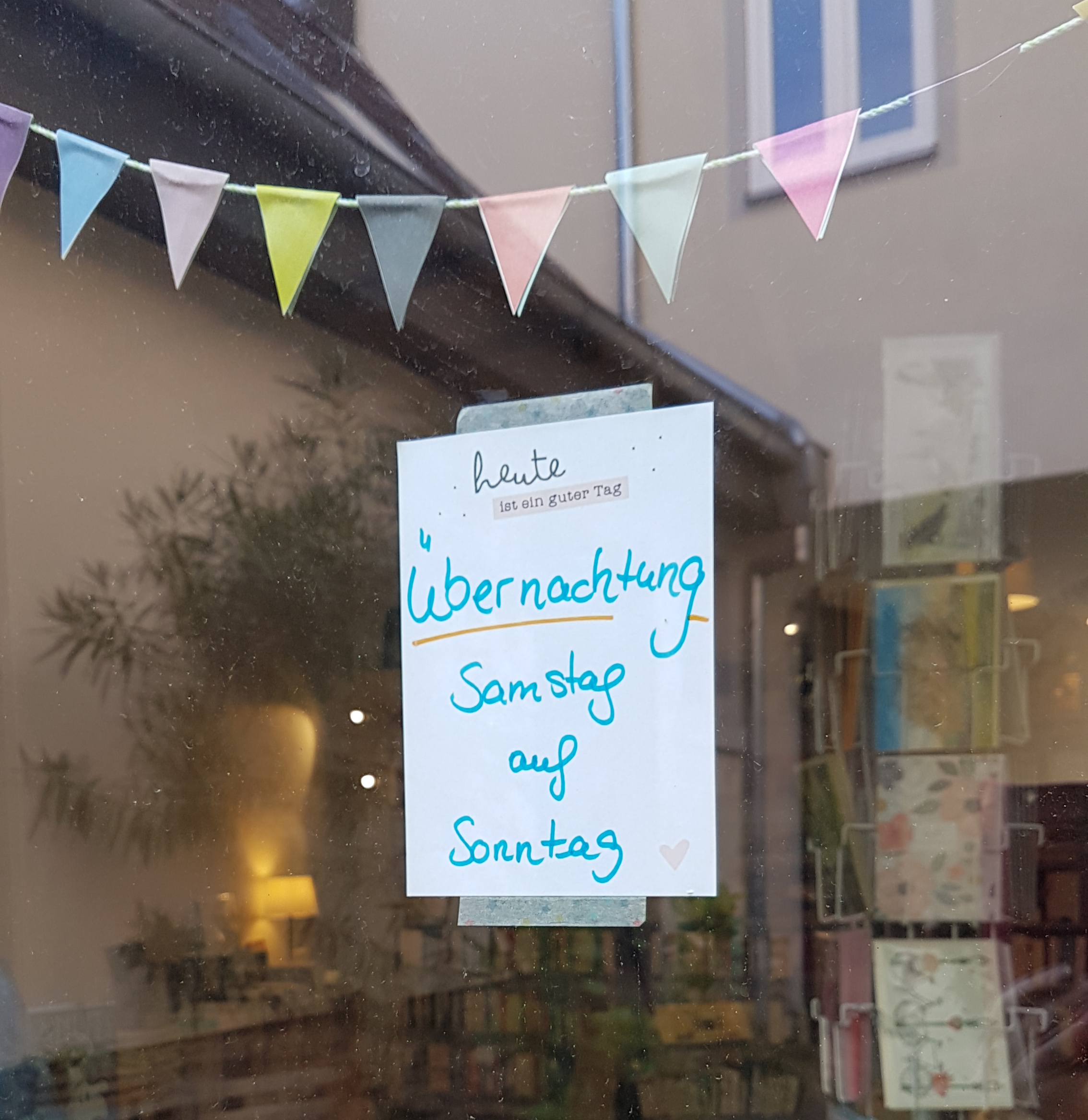 Mein Herzensmann schenkte mir das allerbeste Geschenk, das man einer Büchernärrin machen kann: Eine Übernachtung in einem Buchladen. Ist das nicht der Hammer??? Und am Wochenende war es soweit. Ich übernachtete mit meinem Liebsten in der hinreißenden Buchhandlung herr holgerssonin Gau-Algesheim. In einem lauschigen Hof direkt am Marktplatz liegt die hyggelige Wohnzimmer-Buchhandlung zentral und doch ausreichend versteckt, dass nicht jeder Flaneur direkt in den Laden schaut. Als ich das gläserne Tor und die Bruchsteinfassade erblickte, Tisch und Bank vor dem Eingang, Kräuter und Blumen drumherum, war ich verliebt. Und als mich nach dem Eintreten Buchgeruch und der Duft frischen Holzes umfing, war ich vollends verloren. Hier wollte ich nicht mehr weg. Und musste ich die nächsten 22 Stunden ja auch nicht!