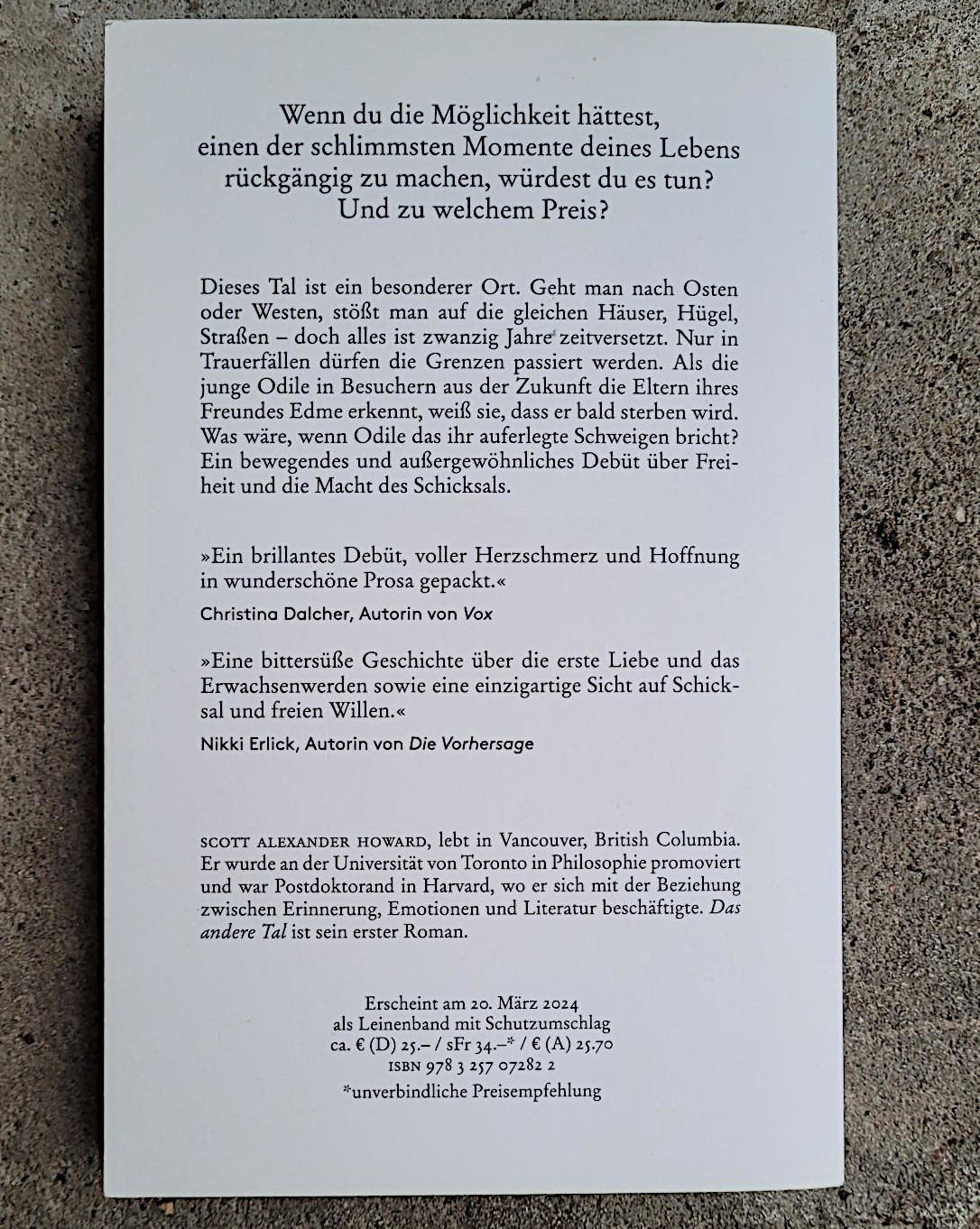 „Das andere Tal“ von Scott Alexander Howard ist ein Gedanken anstoßender Zeitreiseroman mit großartiger Grundidee. Bedacht und manchmal gar betulich erzählt, bündelt der übersichtliche Kosmos einen intensiven Brennpunkt auf Fragen der Moral und der Selbstbestimmtheit. Wie sehr sind wir Spielball des Schicksals? Geben Regeln Sicherheit? Oder begrenzen sie? Verhindern Veränderung und Fortschritt? Überwiegen Vorteile oder Nachteile?