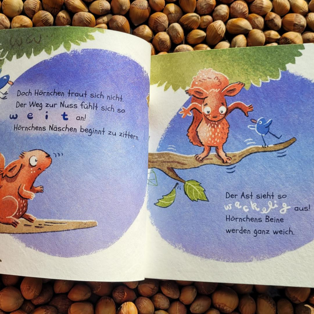 Wenn das Kind älter wird, wird auch der Text von Nanna Neßhöver interessant. Denn es ist eine vertraute Geschichte. Hörnchen möchte etwas, doch weiß nicht wie. Das kennen Kinder. Unbekannte Situationen machen Angst. Doch wenn vertraute Personen Halt geben, wachsen wir über uns hinaus. Springen nach der Nuss. Fangen an zu laufen. Klettern auf die Rutsche. Gehen in die KiTa.