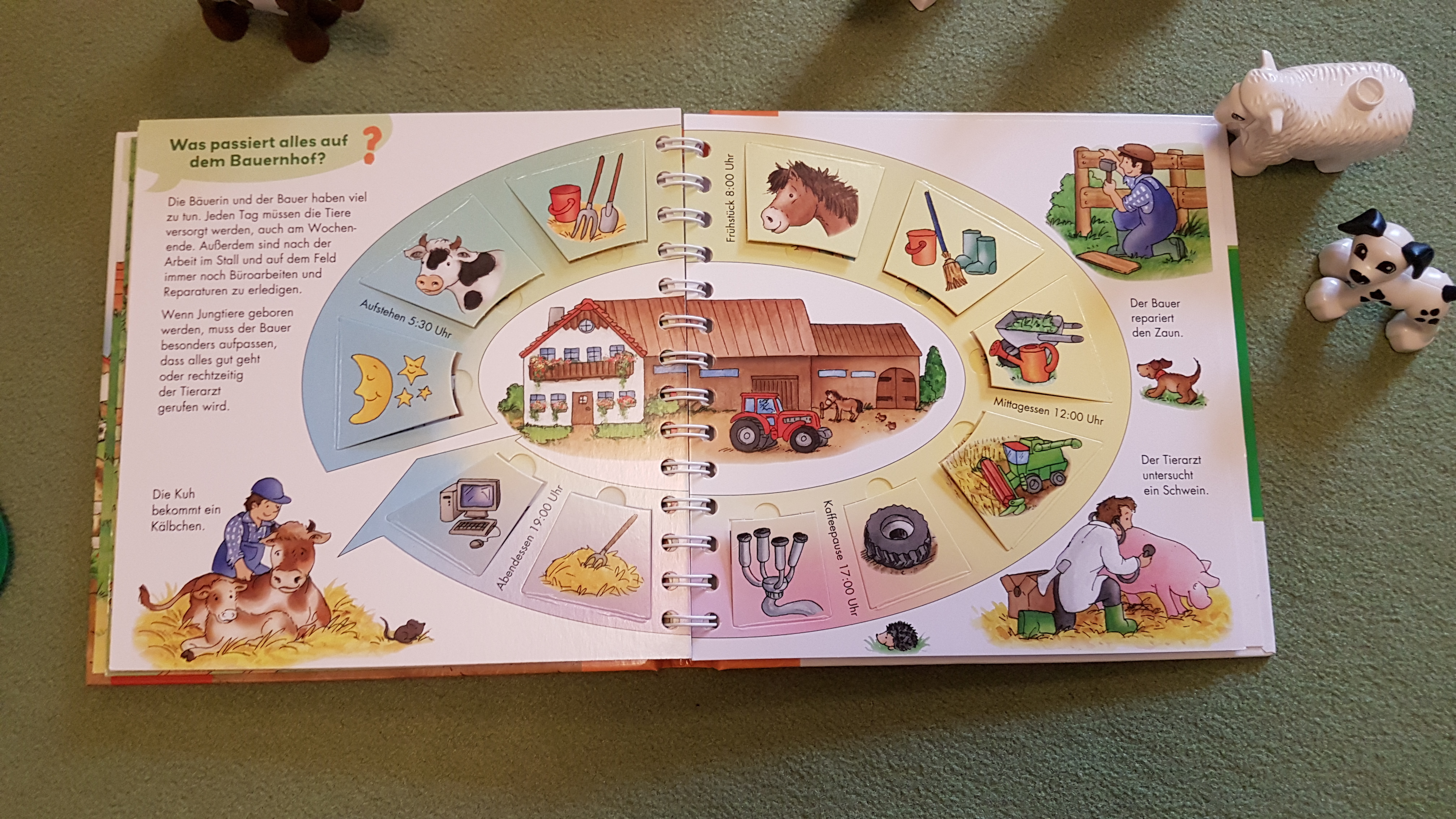Mit gefällt besonders die Seite mit der Frage „Was passiert alles auf dem Bauernhof?“. Anschaulich zeigt hier eine Tagesuhr mit vielen, vielen Klappen, wie lang und anstrengend der Bauernhoftag ist. Das hat auch meine Jungs sehr beeindruckt!
