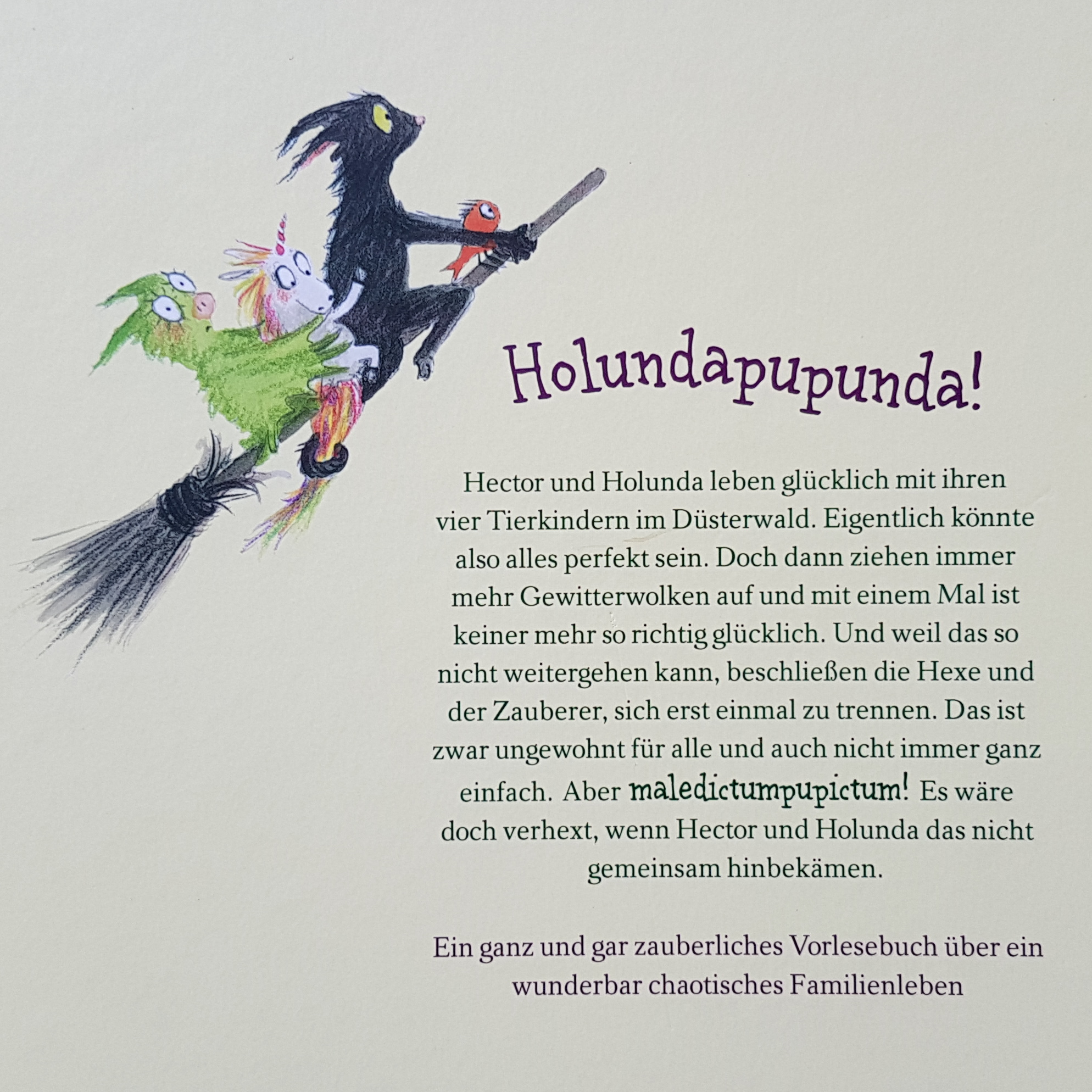 Hexe Holunda und Zauberer Hector lebten also glücklich in ihrem schiefen Hexenhäuschen im Düsterwald. So glücklich, dass sie zusammen vier wundervolle, kleine Wesen schufen: Kund Kumin, Fleule Filine, Einchen Ojo und Spisch Ips. Zu sechst war das Leben wild und wuselig und wunderpupundatoll. Die Jahreszeiten zogen vorüber und meistens waren alle fröhlich. „…manchmal wurde auch geschimpft und gestritten…Aber jeder Streit ging vorbei und am Ende wurde wieder gelacht. Allerdings änderte sich das eines Tages.“