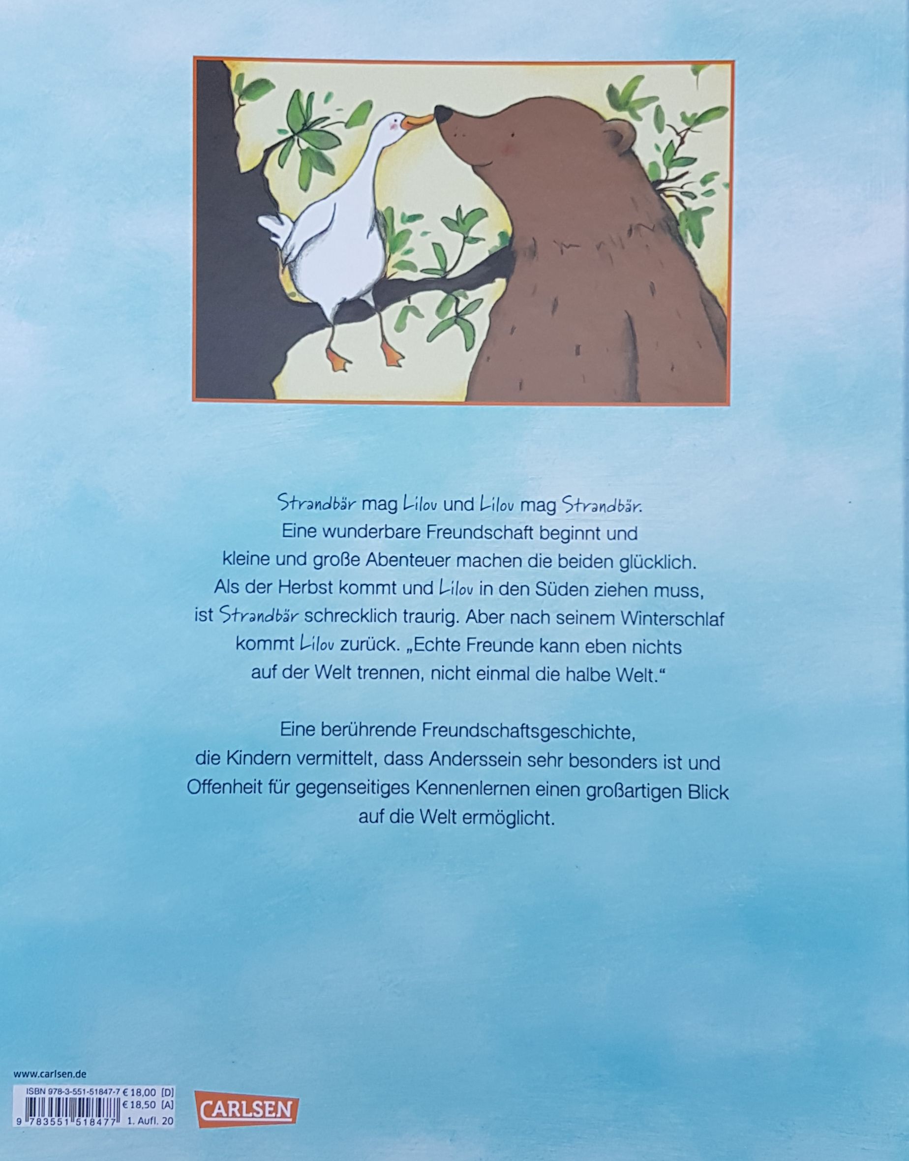 Eines Tages findet Strandbär Vogel Lilou im Schilf. Lilous Flügel ist verletzt. Strandbär pflegt Lilou gesund. Obwohl Lilou weiß ist und Strandbär braun; obwohl er groß ist und sie klein: Sie werden die besten Freunde. Trotz ihrer Unterschiede. Und das ändert sich auch nicht als Lilou ins Warme fliegt und Strandbär schläft.