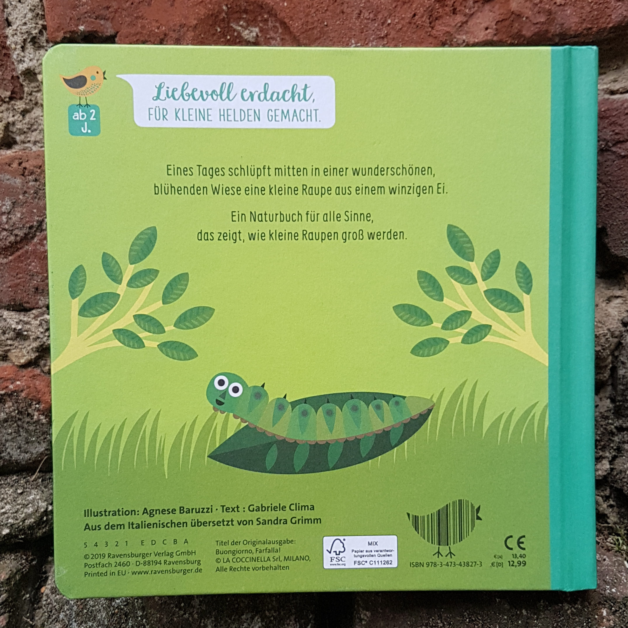 Mein Vizechef wird im November drei Jahre alt. Ihm gefällt „Die kleine Raupe“ richtig gut. Er streicht über die Seiten, sucht das Ei, flattert mit dem Schmetterlingsflügel. Lässt sich die wenigen Sätze gerne vorlesen und genießt es, das Buch mit Mama, Papa oder dem großen Bruder anzuschauen; er schaut es sich aber auch gerne alleine an. Was uns Großen beim Aufwachen am Wochenende ein paar wertvolle Minuten gibt. ? Der Verlag empfiehlt das Buch ab Zwei. Ich denke aber, dass auch schon jüngere Kinder Freude an den bunten Bildern haben werden.